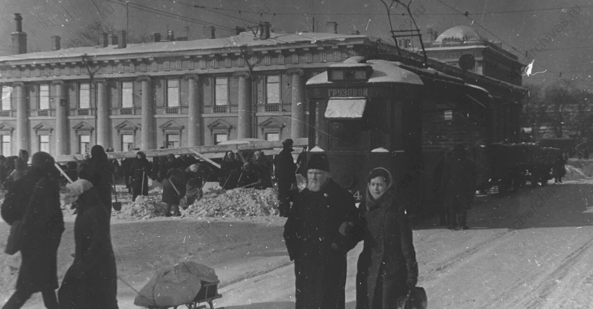 Разгрузка машины на Семеновском мосту во время воскресника по уборке снега и льда. Апрель 1942 г. Автор съемки: Капустин Владимир Илларионович. ЦГАКФФД СПб. Ар 10377